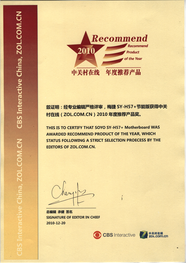 2010-中關(guān)村在線(xiàn)-梅捷H57節(jié)能主板獲中關(guān)村2010年度推薦產(chǎn)品獎(jiǎng)