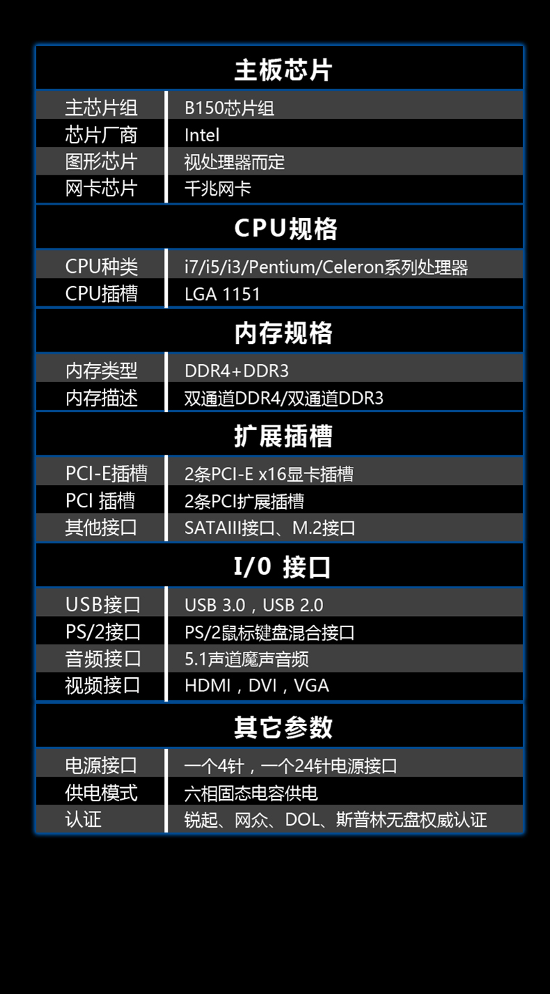 | 主芯片組 | INTEL B150 |