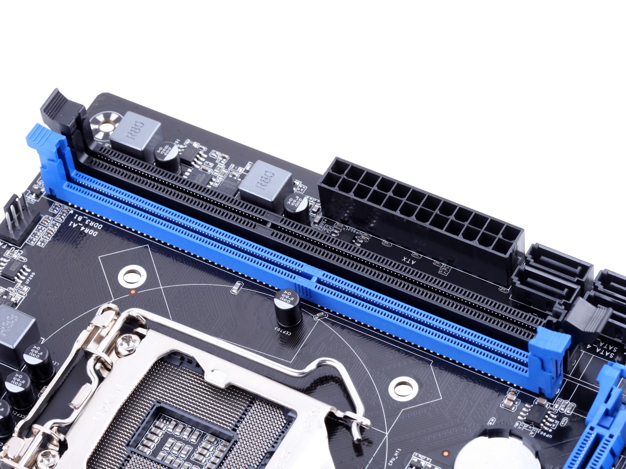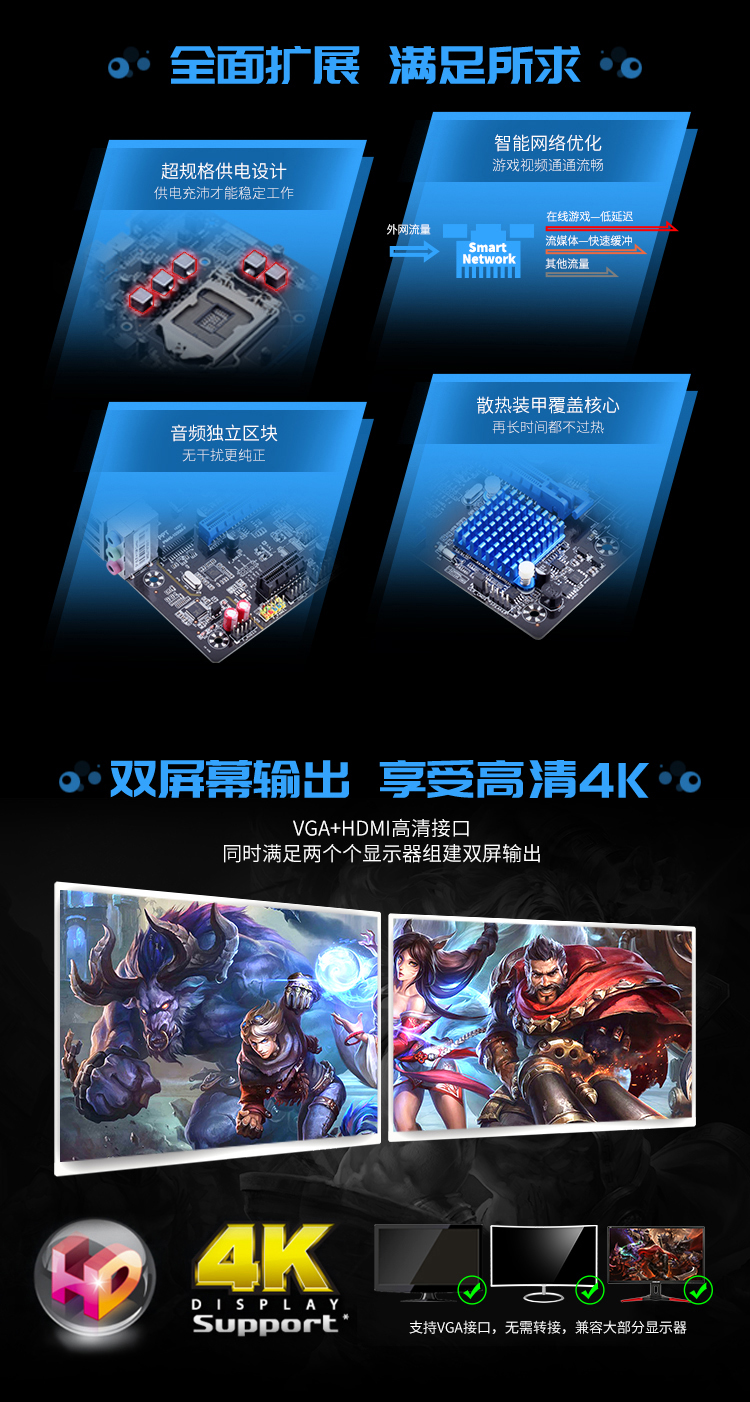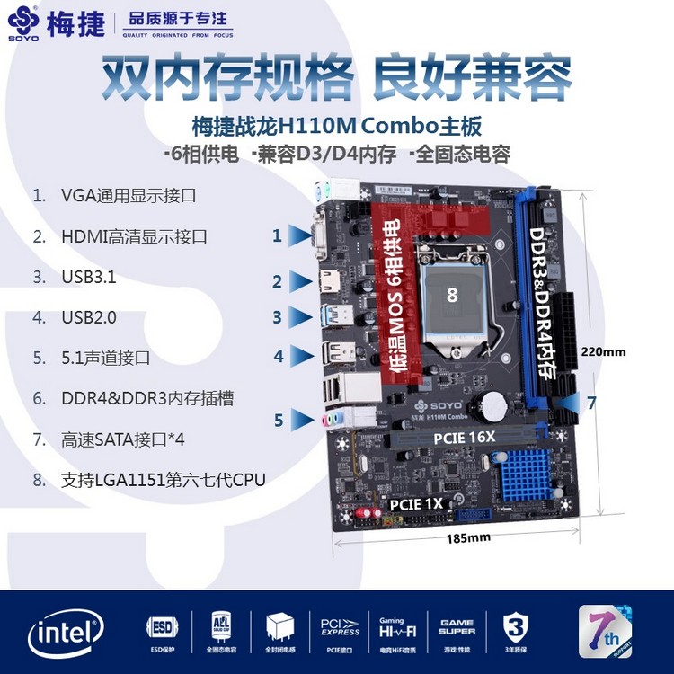 扎實供電,支持DDR3/DDR4內(nèi)存(需插入對應(yīng)內(nèi)存插槽,不能混插與同時插),音頻分割線,音頻電容,SATA3.0,USB3.0