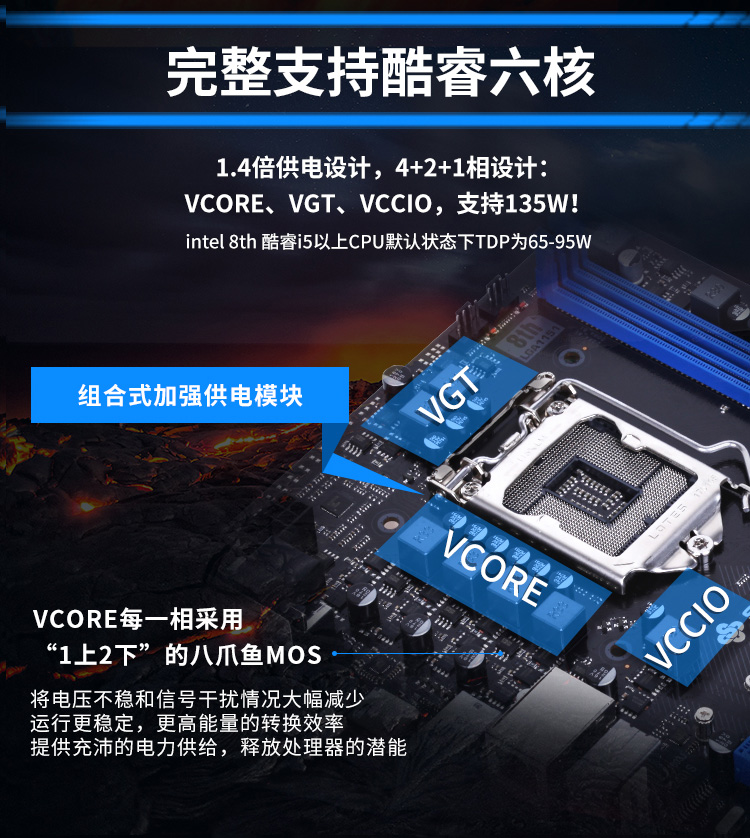 梅捷狂龍B360M采用7相供電,完整支持第八、九代酷睿處理器,1.4倍供電設計最高支持135W。選用服務器級的電器元件,全固態(tài)黑金電容,發(fā)熱量更低,低溫八爪魚MOSFET,更低阻抗更高效率,更低的發(fā)熱量提升主板的穩(wěn)定性,全封閉的鐵素體電感,完善的屏蔽能力,減少電磁干擾,電流容量提升30%,散熱性能更佳穩(wěn)定高效,保證主板長久穩(wěn)定高效的使用。