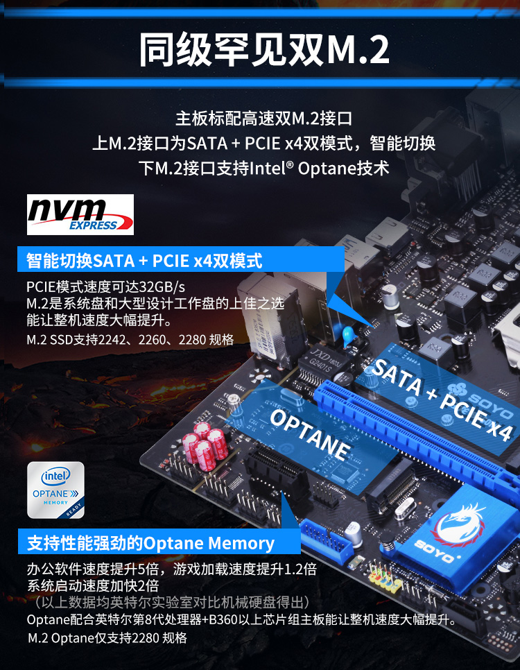 主板標配高速雙M.2接口,智能切換SATA+PCle*4模式,速度可到32GB/S。還可支持英特爾Optane加速技術,讓你的機械硬盤更上一層樓。M.2讓整機的速度大幅提升,游戲加載速度也大大提升。