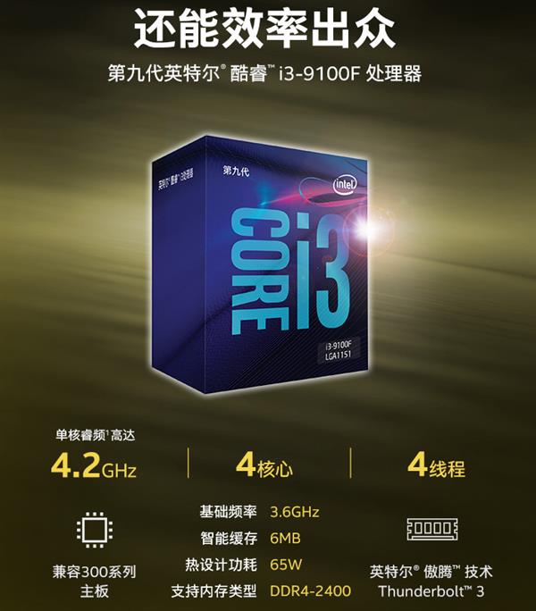 眾所周知,Intel九代的酷睿處理器,有著一個很大的改變,就是增加了帶“F”的版本,而這個帶“F”的版本,就是指不帶集顯。而作為入門級酷睿,i3-9100F會是高性能辦公裝機的好選擇,這款處理器配備4核4線程,6MB緩存,基礎頻率3.6GHz,但加速頻率提升至4.2GHz,支持DDR4-2400內(nèi)存。