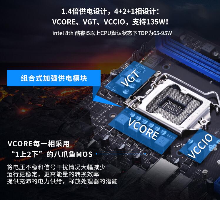 狂龍B360M,采用4+2+1共7相供電,完整支持酷睿6核處理器,服務器級的電器元件,全固態(tài)黑金電容,發(fā)熱量更低,低溫八爪魚MOSFET,更低阻抗更高效率,更低的發(fā)熱量提升主板的穩(wěn)定性,全封閉的鐵素體電感,完善的屏蔽能力,減少電磁干擾,散熱性能更佳穩(wěn)定高效,保證主板長久穩(wěn)定高效的使用。