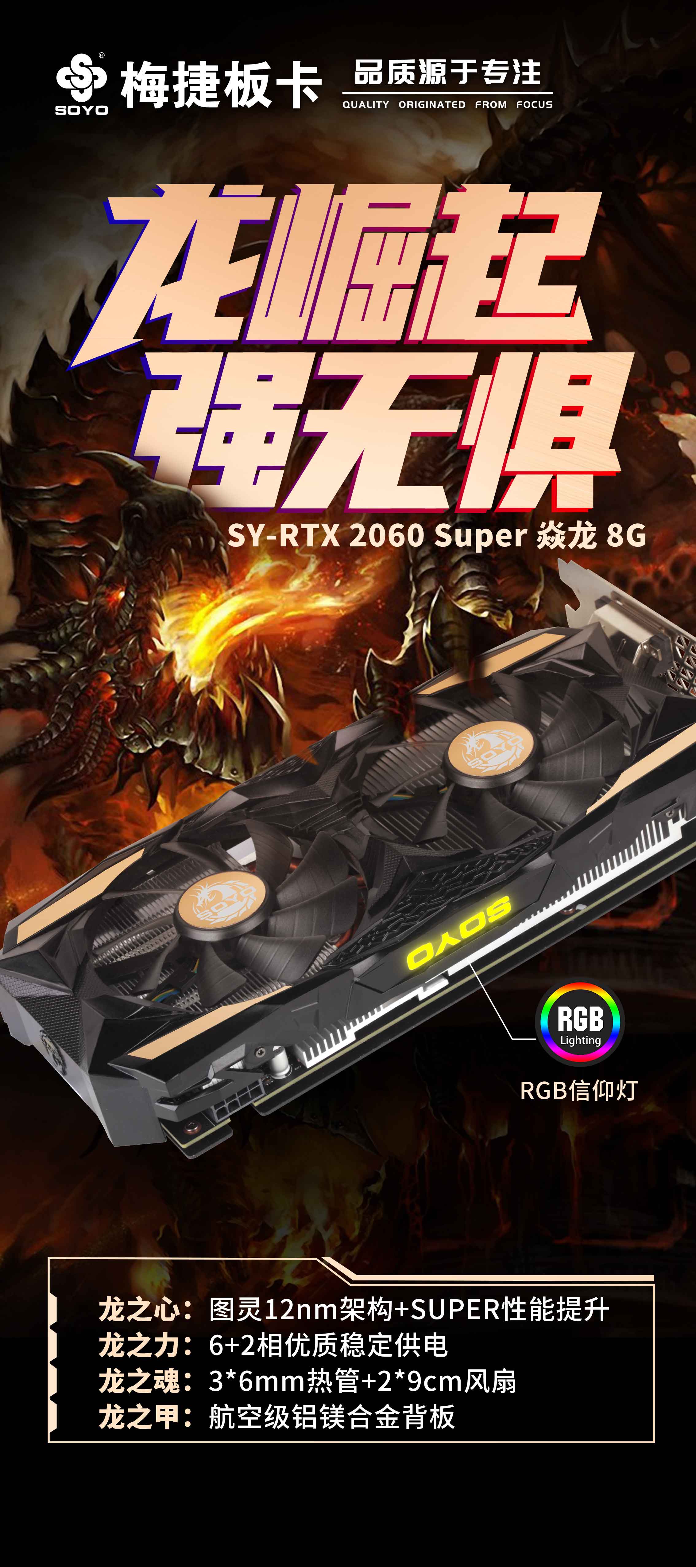 梅捷RTX 2060 SUPER 焱龍 8G采用雙風(fēng)扇+焱龍散熱系統(tǒng),優(yōu)秀的散熱完美鎮(zhèn)壓顯卡溫度。外形硬朗有型,旗艦級(jí)的供電設(shè)計(jì)能令顯卡運(yùn)行更穩(wěn)定,性能自然不多講,已經(jīng)是顯卡里面前幾名的性能了。
