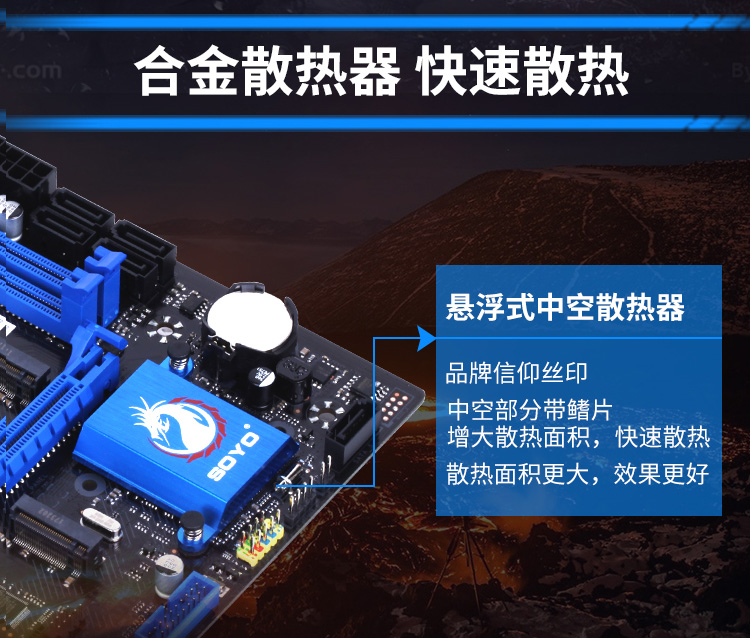 南橋采用懸浮式的中空合金散熱器,增大散熱面積,快速散熱,效果更好。梅捷每一款產(chǎn)品出廠之前經(jīng)過嚴(yán)格的出廠測試,保證穩(wěn)定的產(chǎn)品質(zhì)量,讓你的體驗(yàn)更加出色優(yōu)秀。