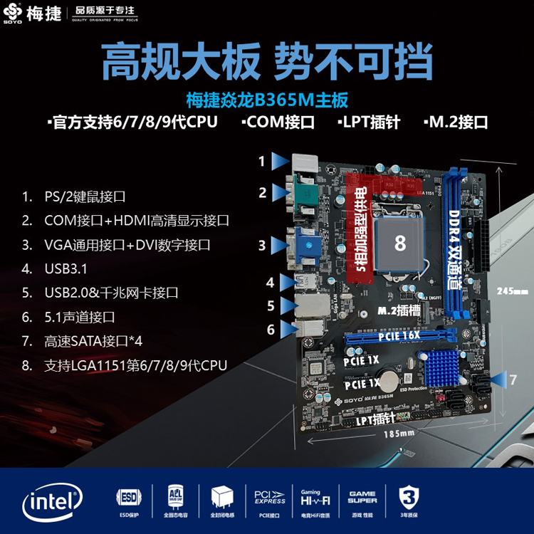 M.2插槽,COM接口,LPT插針,DDR4內(nèi)存,SATA3.0,USB3.1
