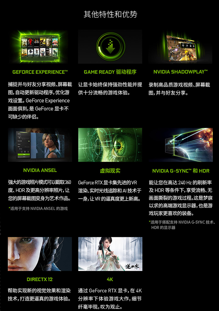 支持Simultaneous Multi-ProjectionVR圖像矯正技術(shù),VRWorks Audio虛擬現(xiàn)實音頻技術(shù),Ansel截圖功能,PhysX物理加速技術(shù),NVIDIA CUDA,PureVideo HD高清硬件解碼,動態(tài)超級分辨率,MFAA,GeForce 3D Vision,GameWorks™,G-Sync™-Ready,GameStream™-Ready,GeForce ShadowPlay™,GPU Boost™