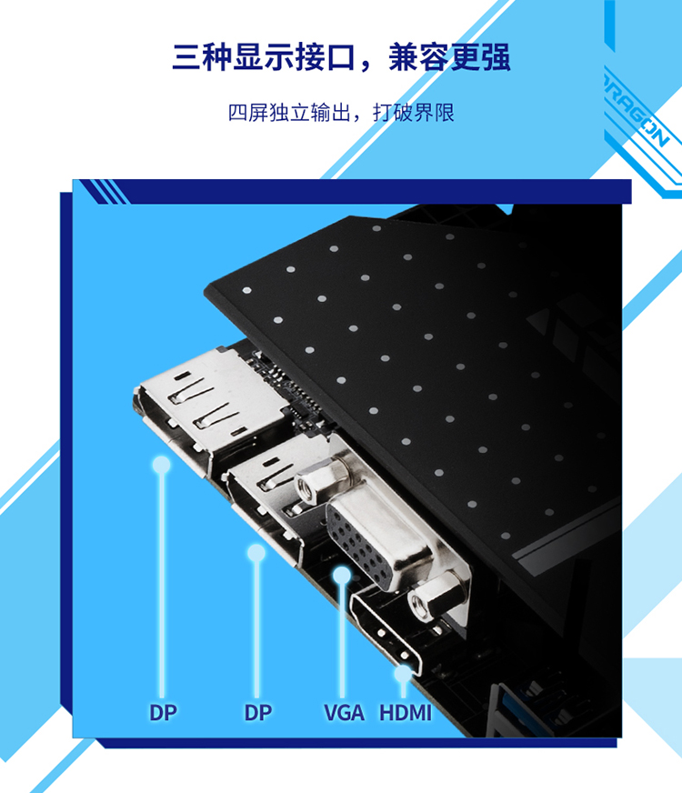 DP接口2個(gè),HDMI接口1個(gè)、VGA接口1個(gè)